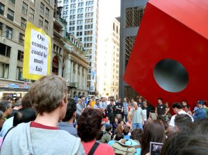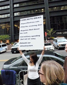 1.) Coming up with policy solutions and proposals should not be the job of Occupy Wall Street. Protestors should not have to have centralized messaging, single-issue demands, or charts and graphs to demonstrate their rationality and seriousness. Occupy Wall Street and its partner protests around the country have pointed a finger at a crisis. They cannot reverse it or make steps to prevent it from happening again without the collaboration of larger social institutions. It is the work of economists, elected officials, the President’s cabinet, members of government agencies, and nonprofit advocacy organizations to put into motion reforms, laws and regulations based on the people’s demands. The people have cried out for help to ensure that corporations don’t have undue influence over our government, that there are no more predatory lenders or rapid stock trading. Now it’s your turn to act, America.